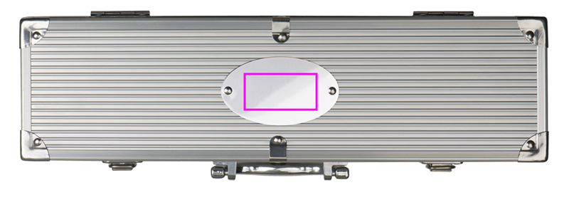 Grillkoffer bestehend aus Grillzange, Fleischgabel und Grillwender im Metallkoffer. Ihr Logo lasern wir auf die ovale Metallplatte des Koffers.