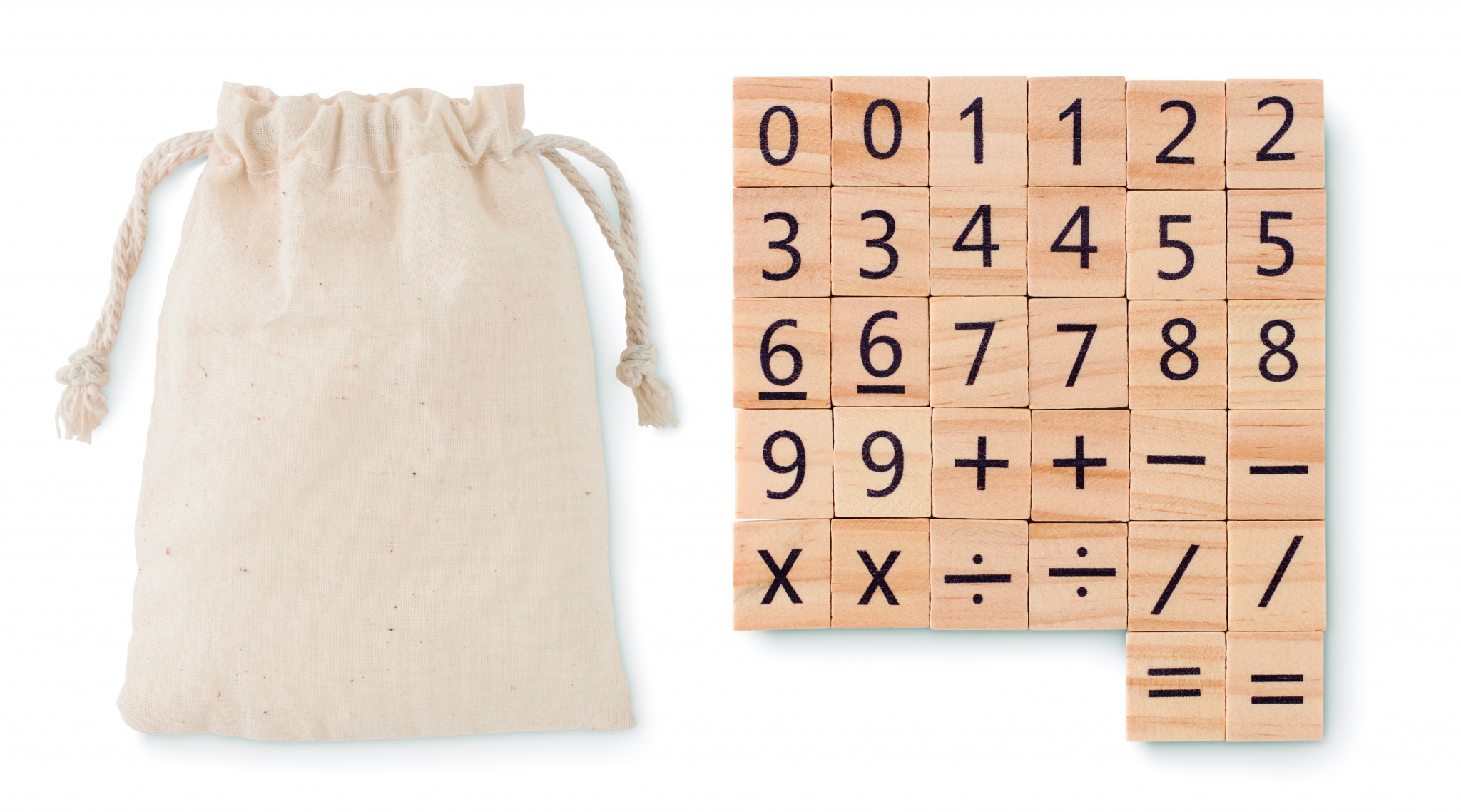 Lernspiel zum Zählen aus Holz. Enthält 32 Teile. Lieferung in einem Beutel aus Baumwolle.