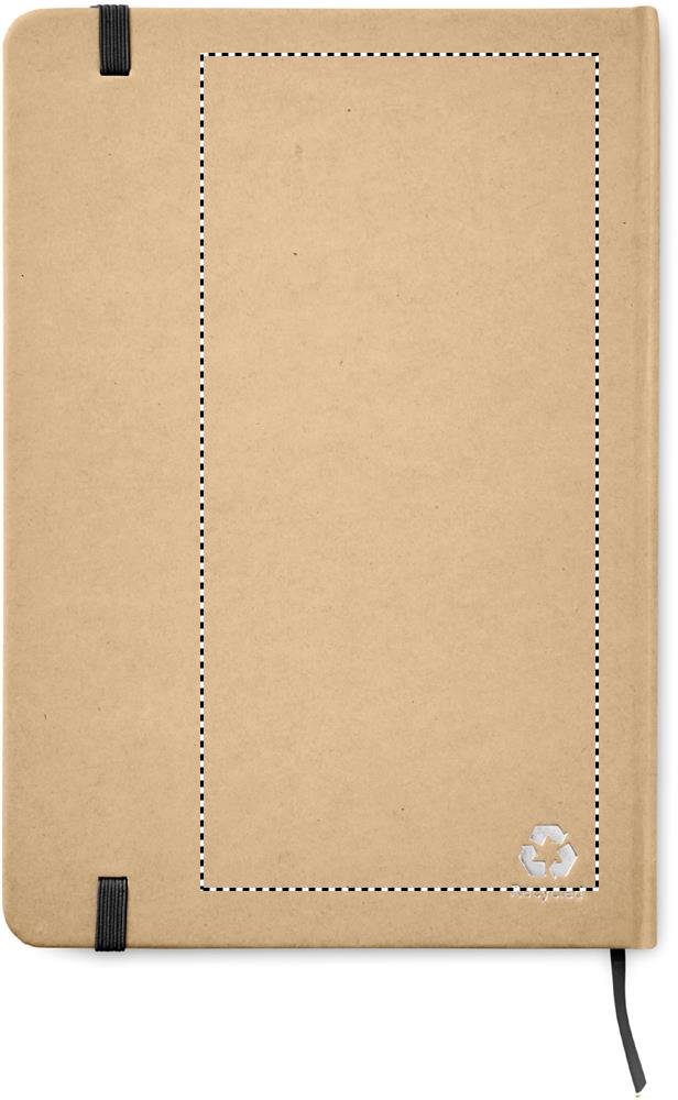 A5 notebook with hard recycled carton cover. Casebound. 160 lined pages (80 sheets). Elastic closure strap, ribbon bookmark.
