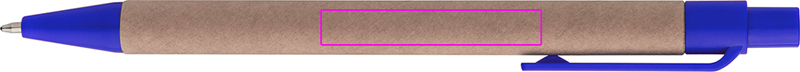 Ballpoint pen made of recycled paper and colored plastic applications, blue writing. Your logo is printed to the right of the clip.