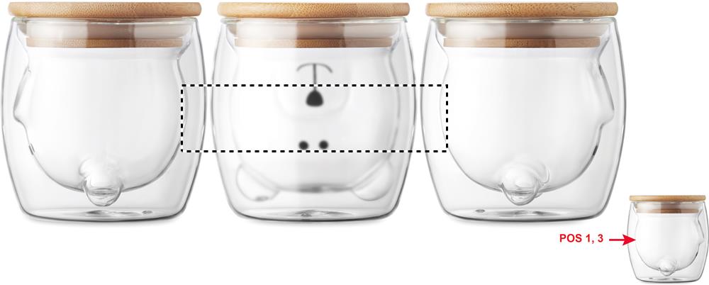 Double wall borosilicate glass mug with bear face design and bamboo lid. Capacity: 260ml. Bamboo is a natural product, there may be slight variations in colour and size per item, which can affect the final decoration outcome.
