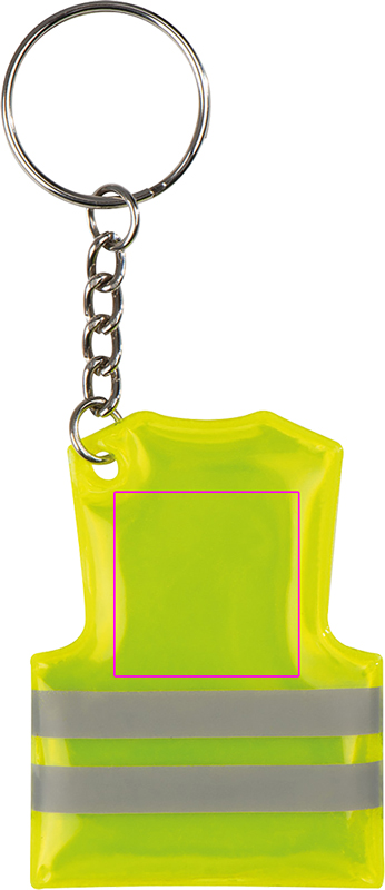 Keyring in the shape of a safety vest with reflective stripes. We print your logo above the stripes.