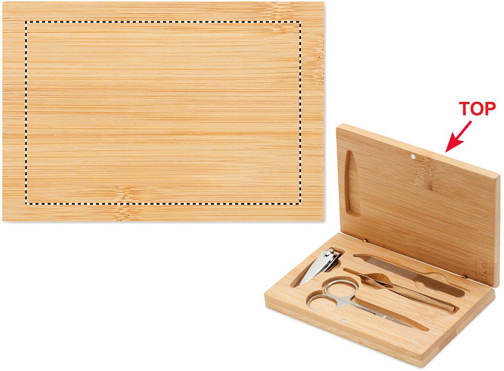 4 piece stainless steel manicure set in a bamboo case with magnetic closure. Including: curved nail scissors, nail clippers, nail file and tweezers. Bamboo is a natural product, there may be slight variations in colour and size per item, which can affect the final decoration outcome.