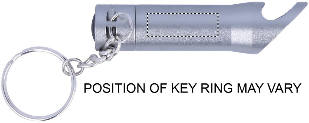 Metal LED torch key ring with bottle opener. 3 cell batteries included.
