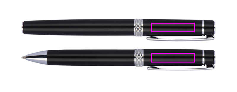 Writing set consisting of a twist ballpoint pen with blue writing system refill and a blue writing rollerball made of aluminum in a case. The chrome applications and the sparkling decorative rings give the set its elegant look. Your logo will be engraved on both pens to the right of the clip.