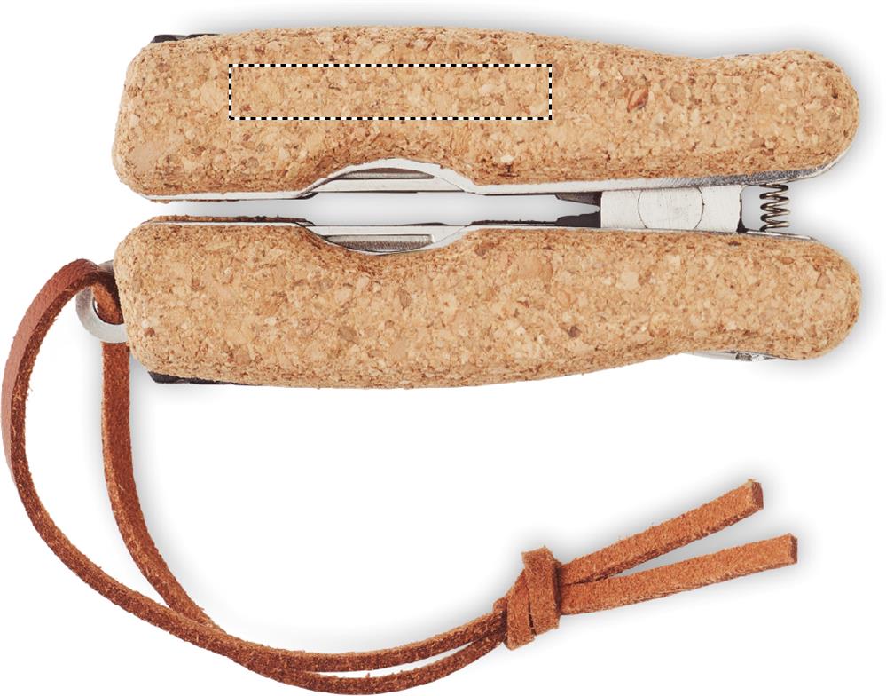 Stainless steel multi-function pocket knife with a cork cover and PU handle cord. 9 functions. It includes: Pliers, 2 openers, screwdriver with Philips bits, saw blades, knife, file and screwdriver with flat bit. Cork is a natural product, there may be slight variations in colour and size per item, which can affect the final decoration outcome.