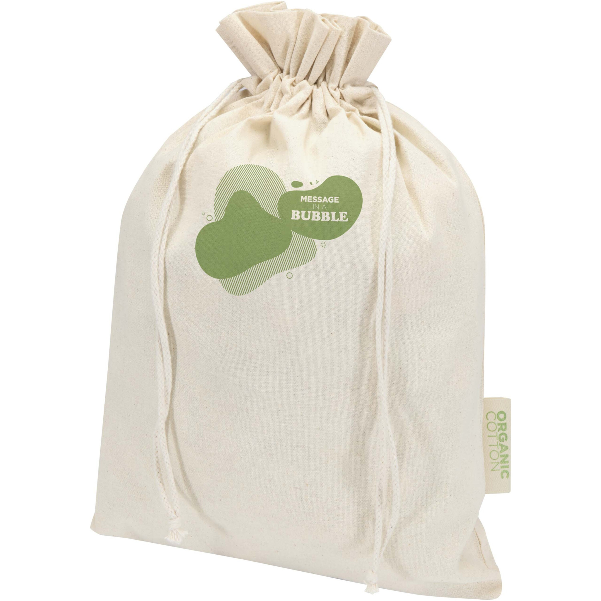 Gift bag made of 100% OCS certified 140 g/m² organic cotton featuring a cotton drawstring closure. Ideal for gifting or storing items. Size: 42 x 30 cm.