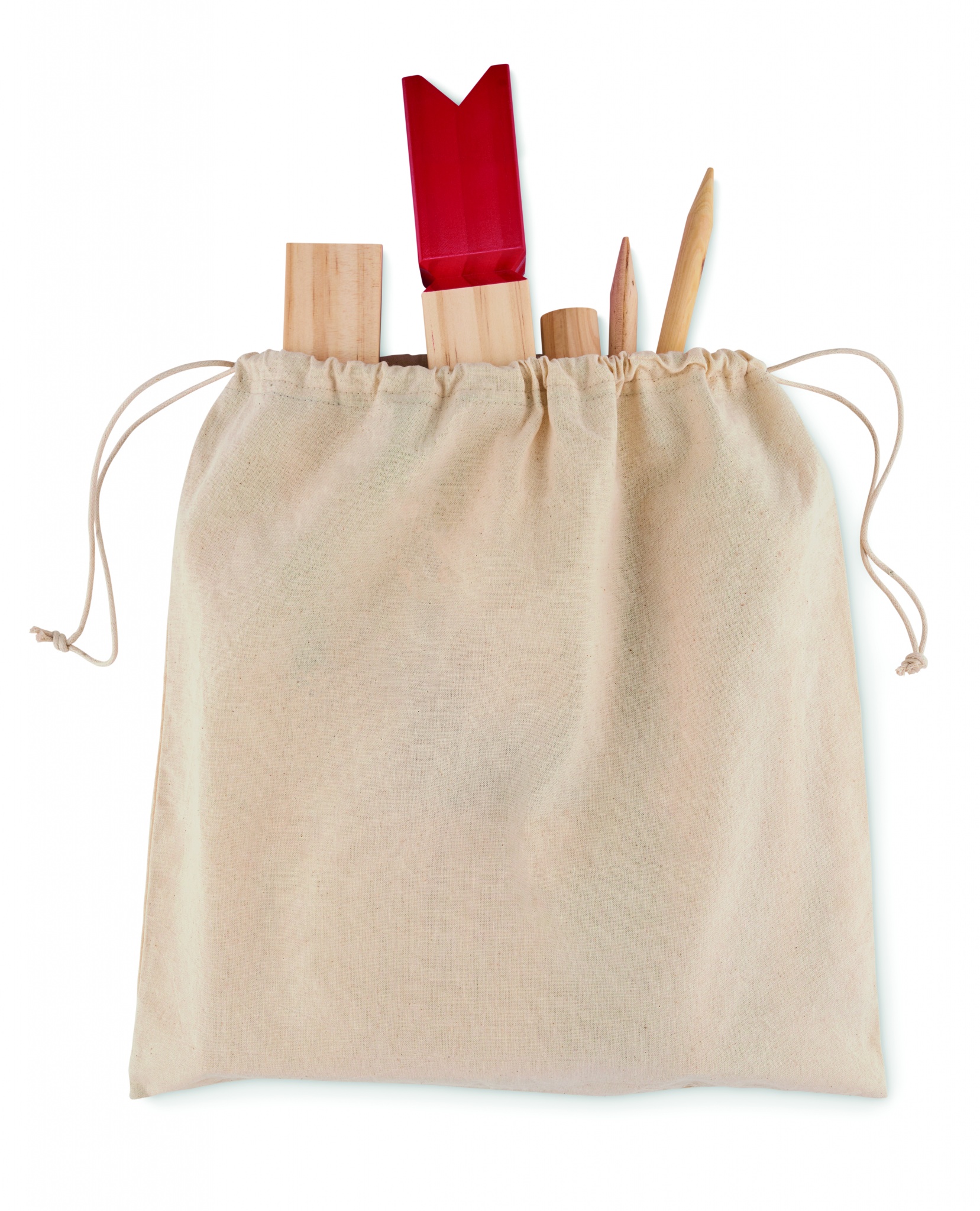 Pine wood throwing game in cotton drawcord bag. Includes 10pcs short square stick, 4pcs pointy stick, 6pcs round stick and 1pc King stick.