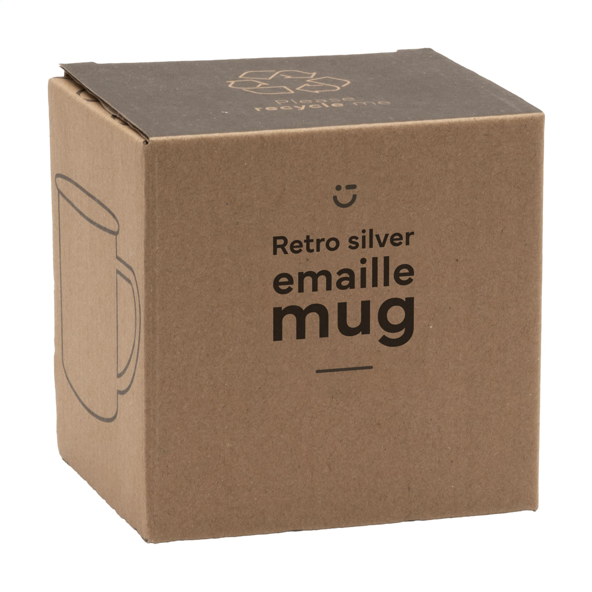 Enamelled mug in popular retro style. Beautiful finish with chrome edge. To accentuate the retro look, the mug has imperfections. Capacity 350 ml. Each item is supplied in an individual brown cardboard box.