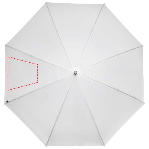 Golf umbrella with a recycled PET pongee polyester canopy fitting 2 persons. The sturdy metal shaft and high quality frame with fibreglass ribs offers maximum flexibility in windy conditions. Together with the wooden handle, tips, and the recycled PET pongee polyester canopy it offers a sustainable choice. Available in a wide variety of contemporary colours with a large decoration area on each of the panels.