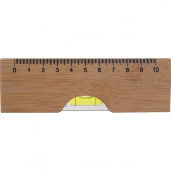 Spirit level made of bamboo with measuring scale and bottle opener. Your logo is applied to the spirit level using laser engraving.