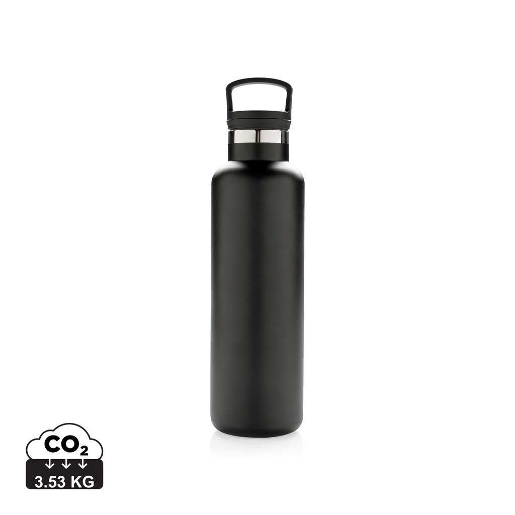 Powder coated double wall vacuum insulated bottle. 2-in-1 lid with filter, perfect for hot tea or infused water. Standard mouth opening, ideal for sipping and adding ice cubes. Built to last, great bottle for any season. 304 SS inner and 201 SS outer keeps your drinks hot for up to 5h and cold for up to 15h. Content: 600ml.