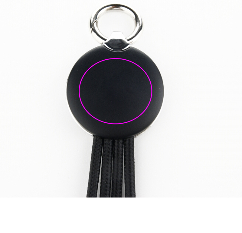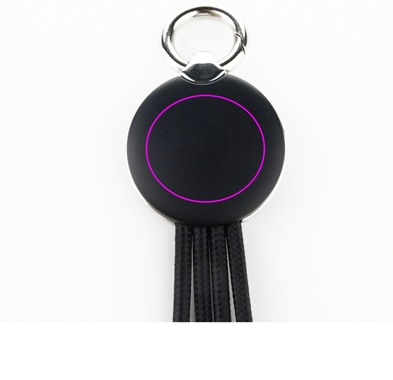 Laadimiskaabel, sisaldab 3 pistikut: mikro-USB, Lightning ja C-tüüpi. Graveeritud logotüüp on valgustatud, kui kaabel on kasutusel.