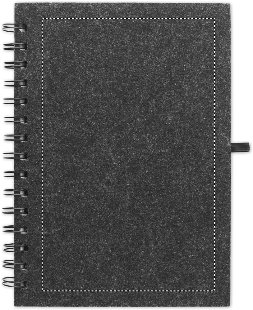 A5 RPET vildist kaanega märkmik. Kahe traadiga köidetud, 160 taaskasutatud joonega lehte 70 gr/m² (80 lehte) elastse pliiatsihoidjaga.