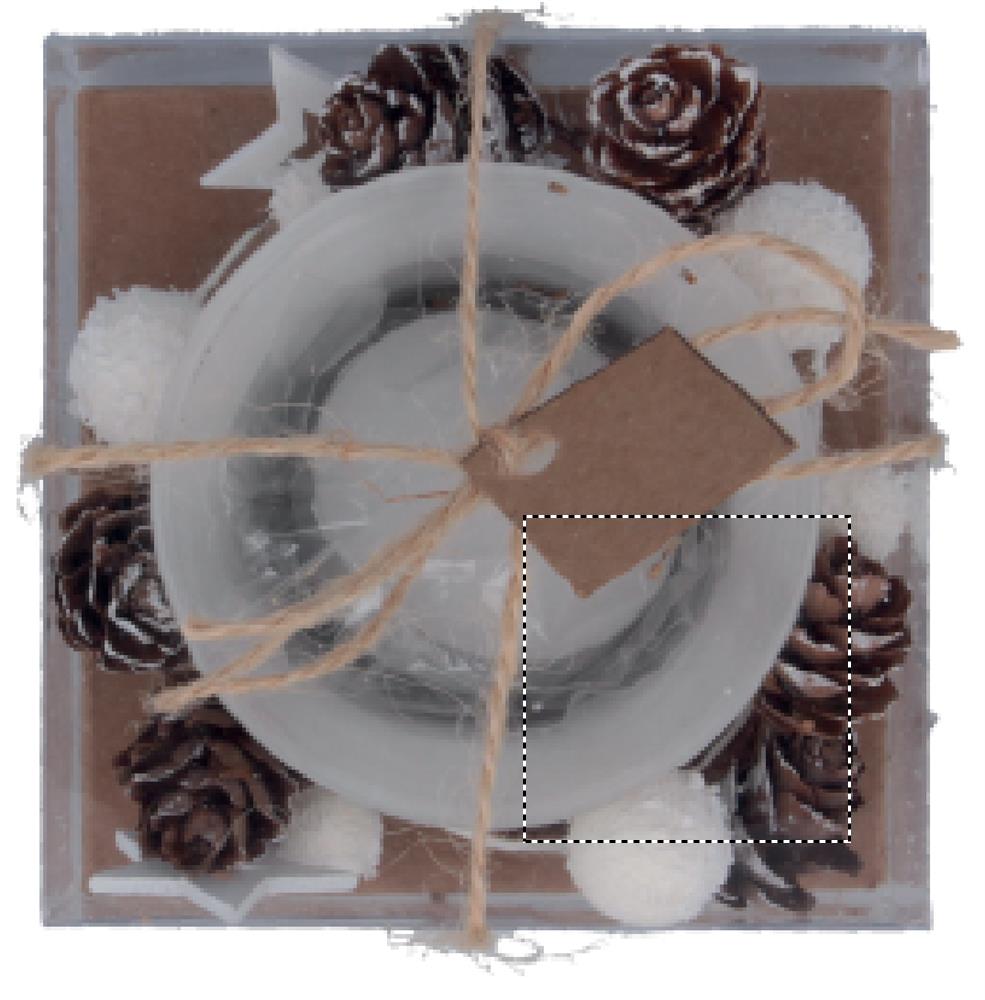 Kaunistustega ümbritsetud klaasist küünlaalus. Esitatakse lindi ja etiketiga papp- ja PVC karbis.