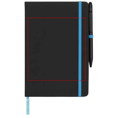 Moodne ja stiilne must märkmik pehme puutetundliku kaanega. Tarnitakse värvilise serva ja sobiva värvilise lehemarkeri, pliiatsi aasa ja sulgemisrihmaga. Kaasas tavaline must pastapliiats. Sisaldab 96 lehte (70g/m2) kreemika voodriga paberit.