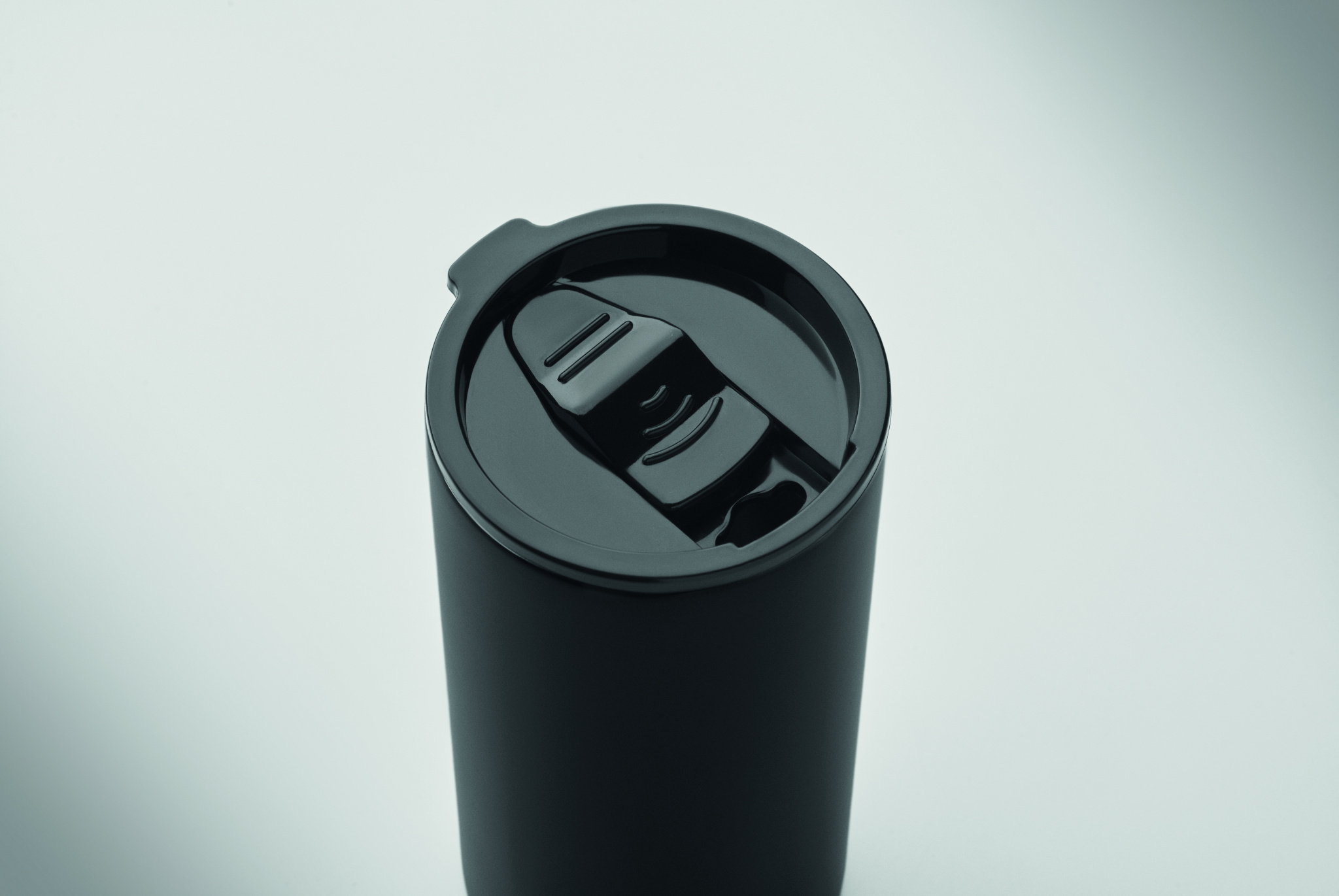 2 in 1 -pullo Tritanista ja kierrätetystä ruostumattomasta teräksestä (90 % kierrätettyä ja 10 % ruostumatonta terästä). 2 kantta PP-materiaalista. Tilavuus yhteensä 610 ml, pelkkä muki 350 ml.