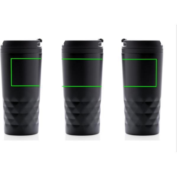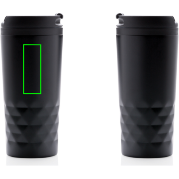 Ruostumattomasta teräksestä valmistettu trendikäs kahvimuki geometrisillä yksityiskohdilla. Sisäosa on valmistettu muovista. Vain käsinpesu. Tilavuus 300ml.