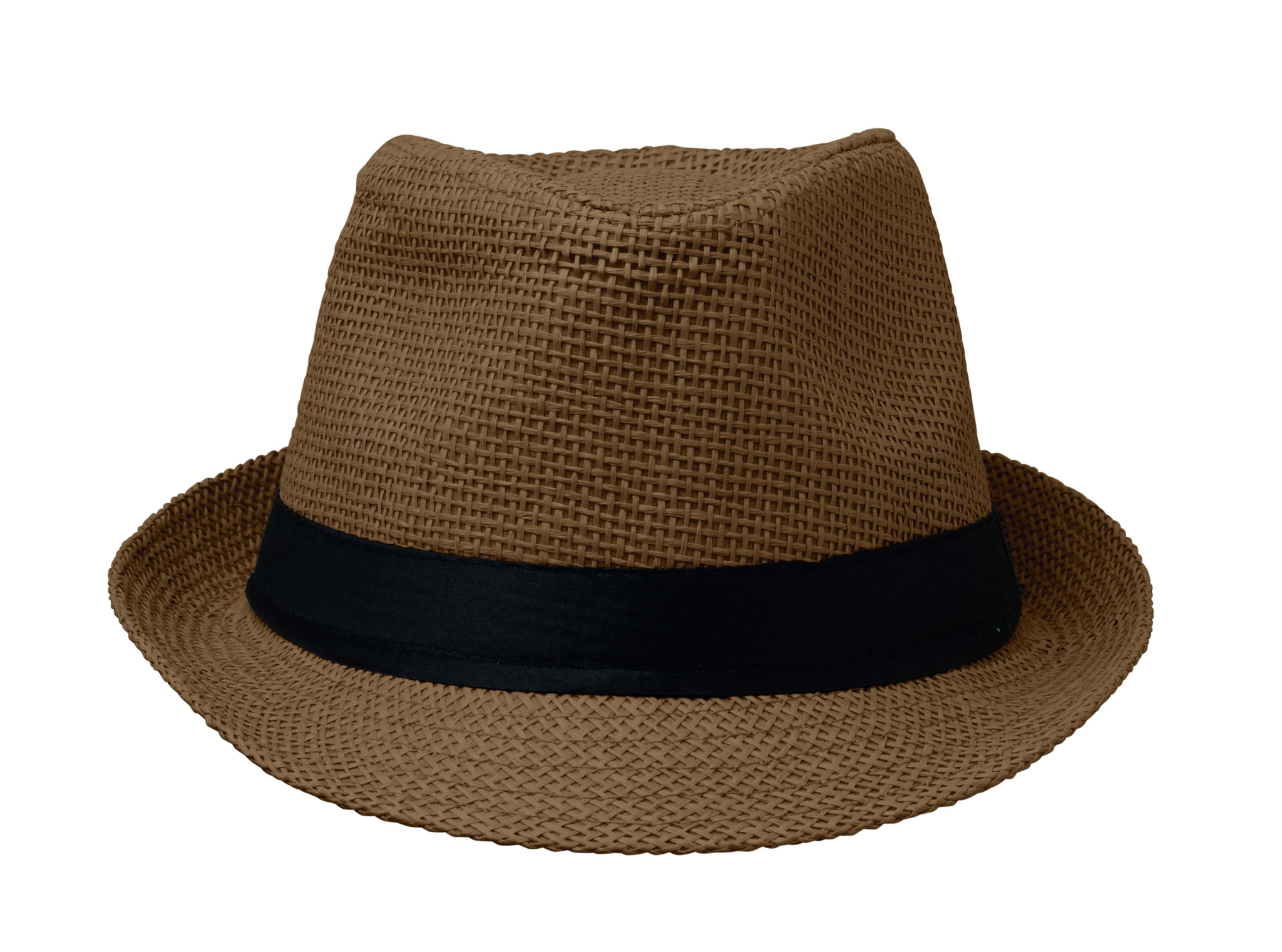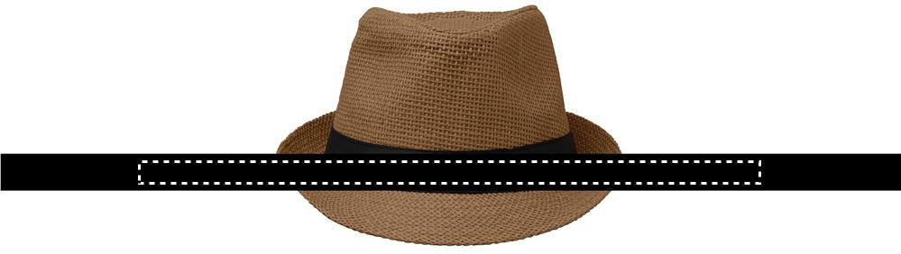 Paperinen olkihattu, jossa musta polyesterinauha. Painamattomissa tilauksissa nauha toimitetaan kiinnittämättömänä.