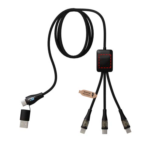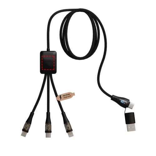 60 W:n kierrätetystä PET-muovista valmistettu 5-in-1-pikalatauskaapeli, jossa on valaistu kaksipuolinen logo ja kolme liitintä (Type-C, iPhone ja Android). Kaapelissa on sekä USB-A- että USB-C-liitin, minkä ansiosta se on täysin yhteensopiva uusimpien tietokonemallien kanssa. Kaapelilla voi ladata useita laitteita samanaikaisesti. Mukana toimitetaan kierrätettäväTPU-pussi sekä kierrätyspaperista valmistettu etiketti. Johdon pituus: 1 metri.