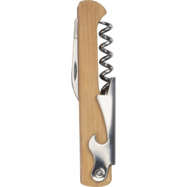Metallinen tarjoilijan veitsi bambupinnoitteella, pullonavaaja, folioleikkuri ja korkkiruuvi. Kaiverremme logosi pinnoitteeseen.