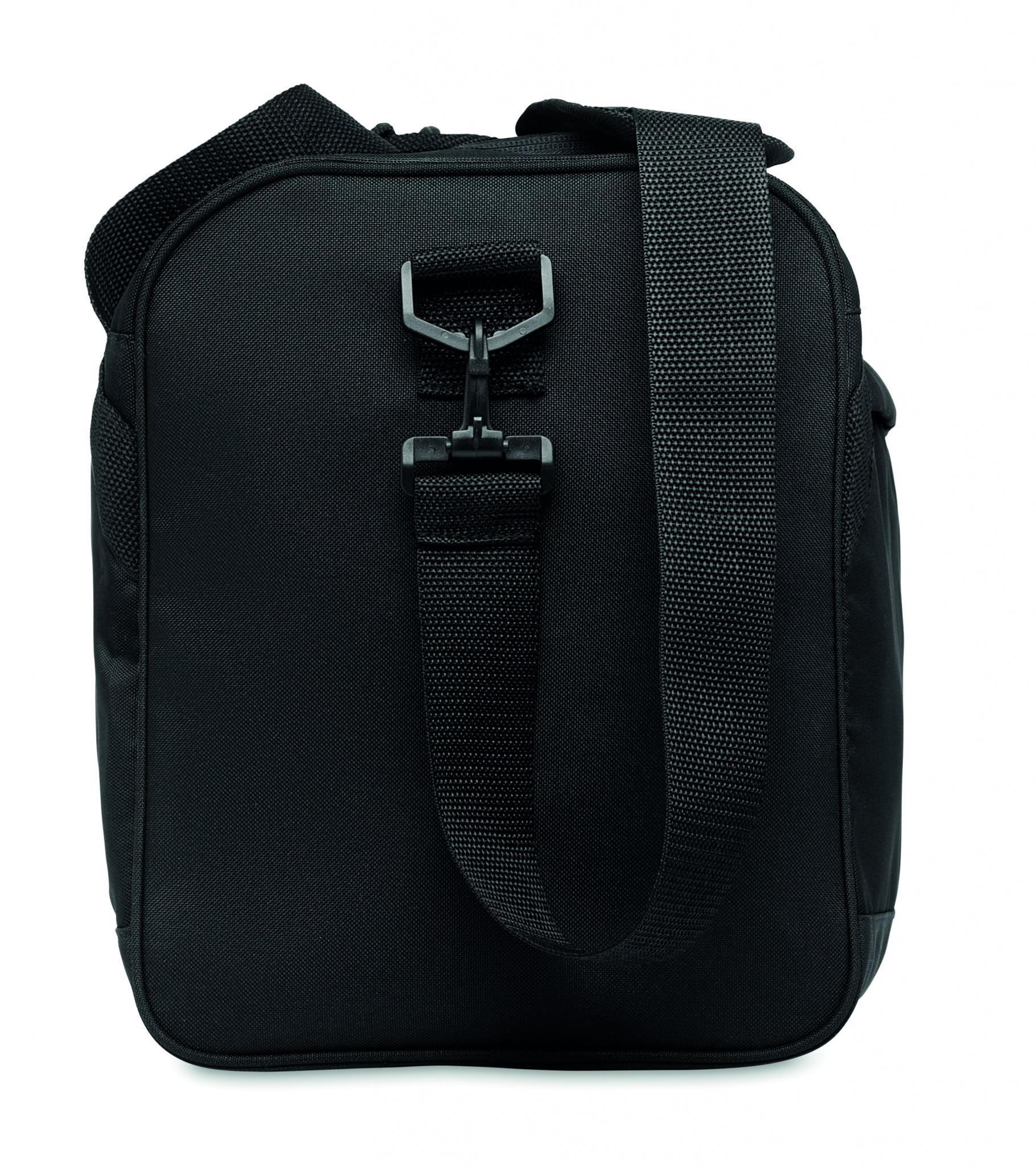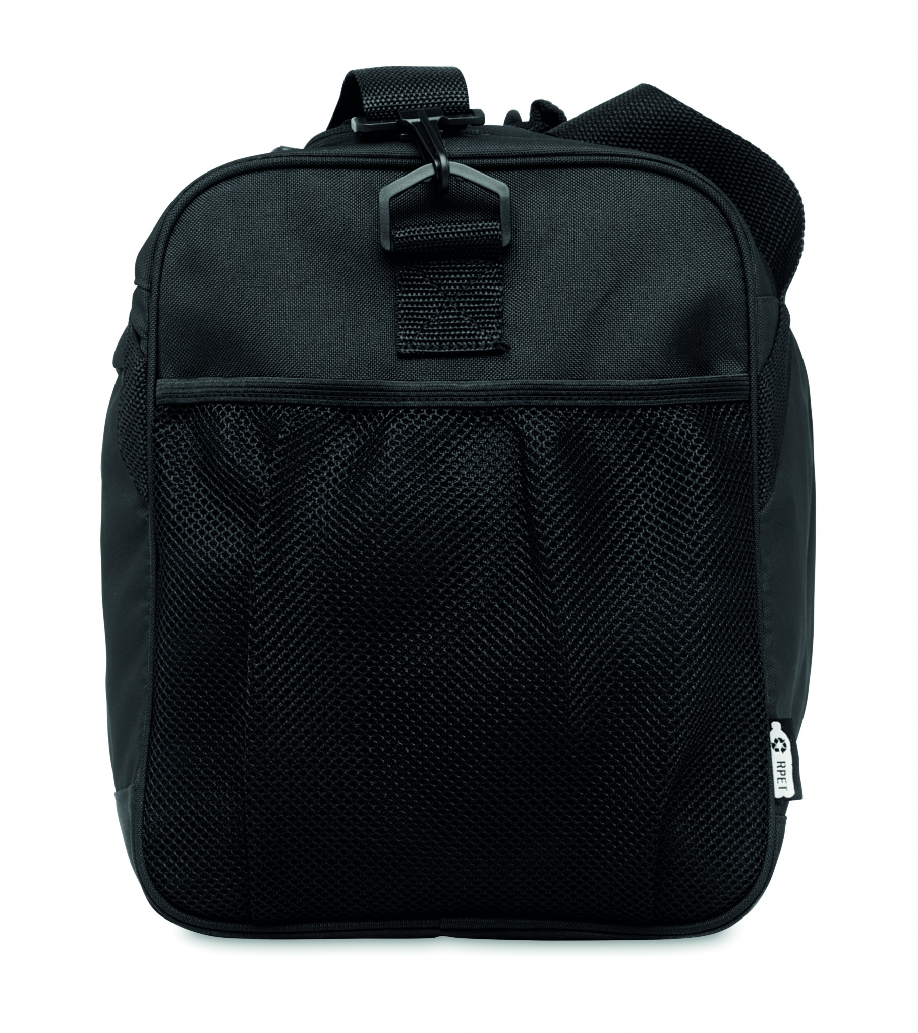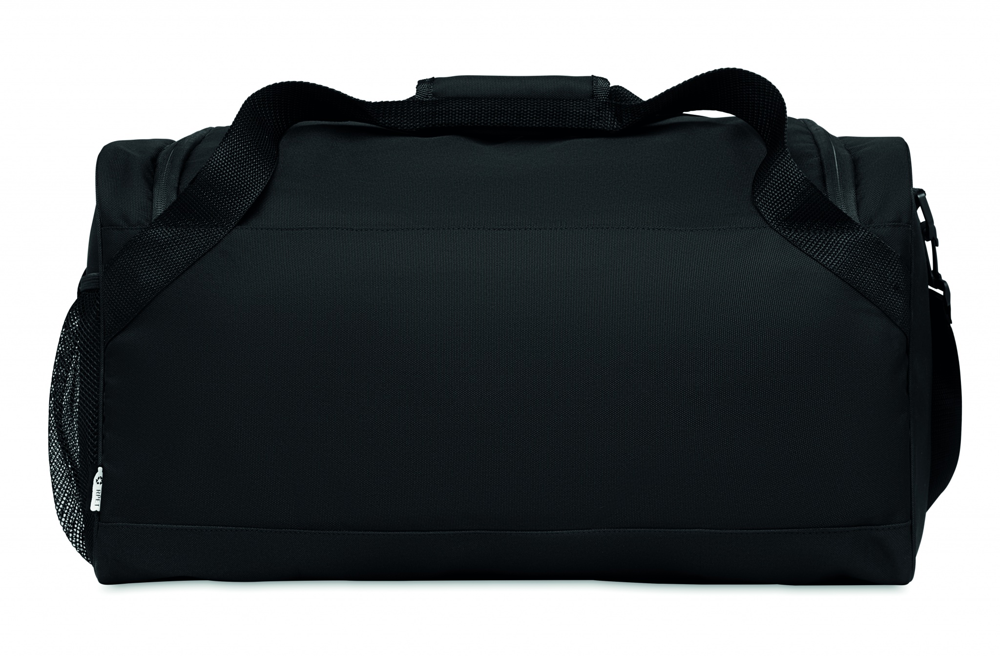 600D RPET urheilulaukku, iso vetoketjullinen etutasku, sisätasku ja säädettävä olkahihna.