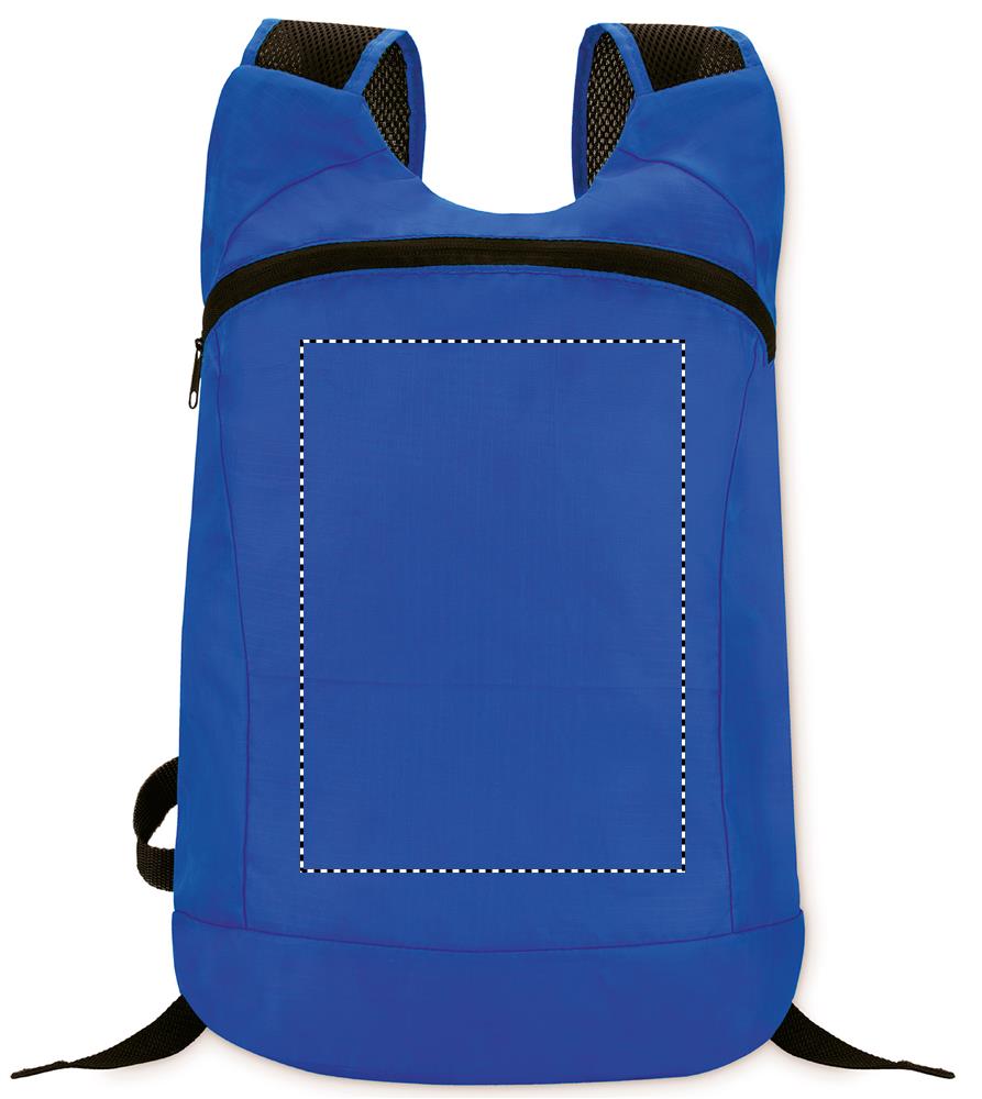Kokoontaitettava urheilureppu ripstop-polyesteristä, vetoketju edessä ja verkkovuoratut olkahihnat, sisältää irroitettavan pienen pussin.
