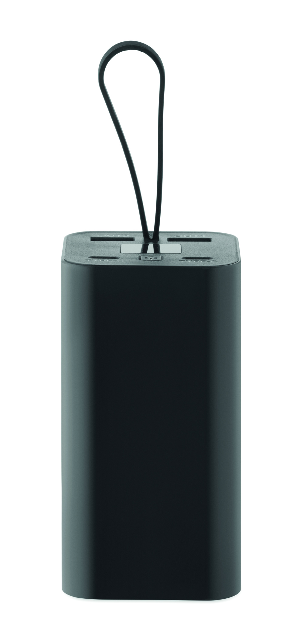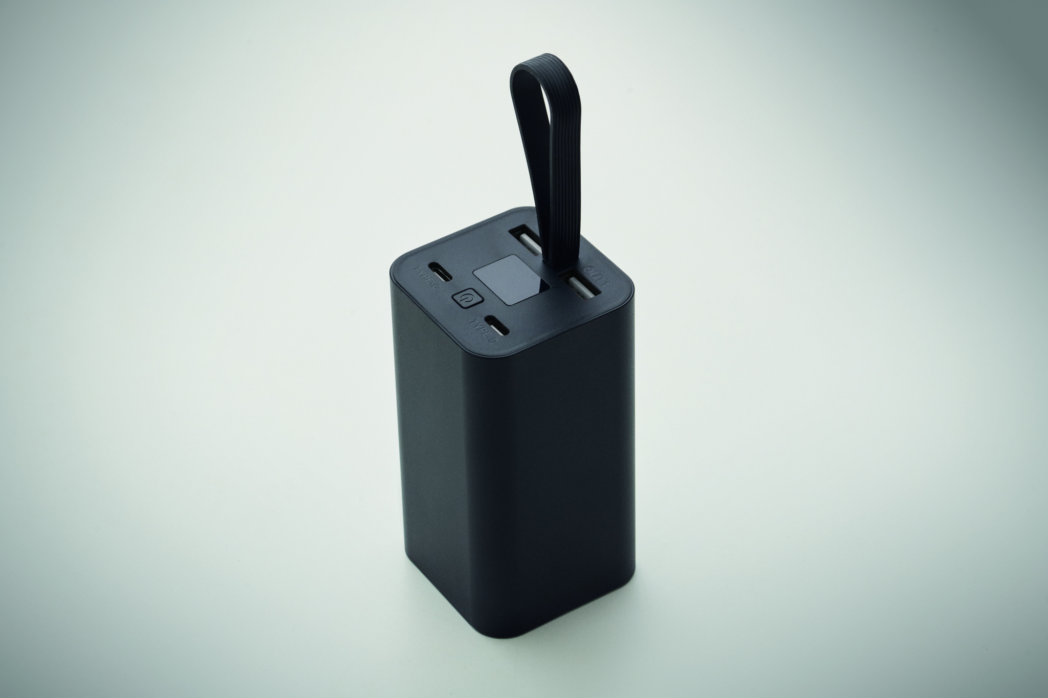 20 000 mAh:n varavirtalähde kierrätetystä alumiinista, jossa on digitaalinen virtanäyttö ja silikoniripustus. Sisältää kaksi Type-C- ja kaksi USB-A-lähtöä sekä PD 65W pikalatauksen.
