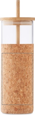 Borosilikatinio stiklo būgninė su kamštine apsaugine mova ir bambukiniu dangteliu bei šiaudeliais. Talpa 450 ml. Kadangi tai yra vienos sienelės puodelis, šilumos perdavimas vis tiek gali vykti. Bambukas yra natūralus produktas, gali šiek tiek skirtis kiekvieno gaminio spalva ir dydis, o tai gali turėti įtakos galutiniam dekoravimo rezultatui.