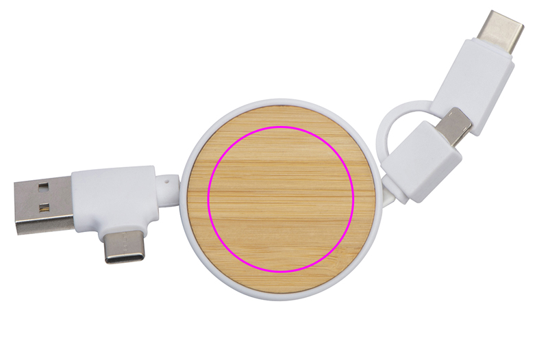 Удлиняемый кабель для зарядки в пластиковом корпусе с бамбуковой пластиной, USB, 2 C-Type и адаптером iOS. Ваш логотип будет напечатан на бамбуковой части.