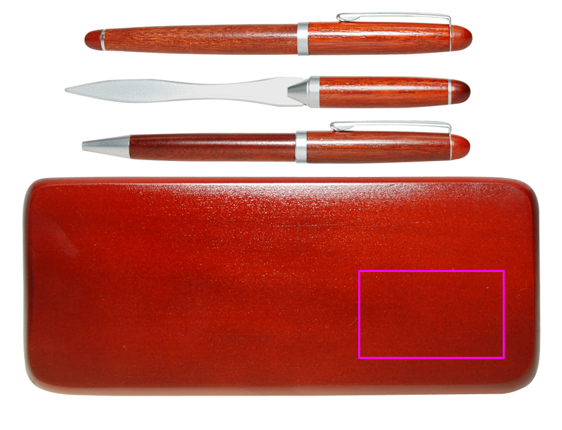 В набор из розового дерева входят: деревянная шариковая ручка с поворотным механизмом и синим металлическим стержнем, деревянная перьевая ручка с синим картриджем и нож для писем. Ваш логотип будет выгравирован на коробке.