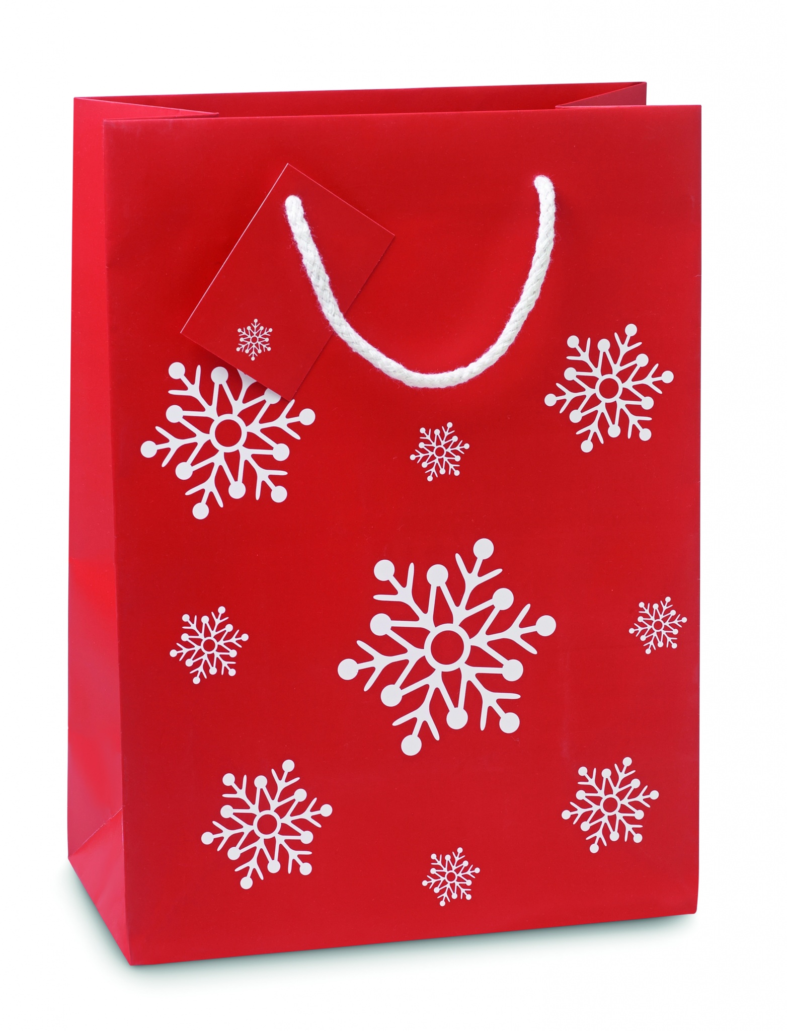 Подарочный пакет в новом новогоднем дизайне, украшенный снежинками. Средний размер.