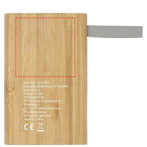 Бамбуковое портативное зарядное устройство с резервным питанием 5000 мАч для мобильных телефонов или других цифровых устройств. Имеет светодиодные индикаторные фонари и перемычки из переработанного ПЭТ. В комплект входит кабель Micro-USB для зарядки. Поставляется в подарочной упаковке, которая на 100 % сертифицирована FSC. В комплекте содержится инструкция, выполненная по стандарту FSC. Поскольку бамбук — природный материал, цвет и размер сырья могут быть разными, что, в свою очередь, может повлиять на итоговый вид отделки.