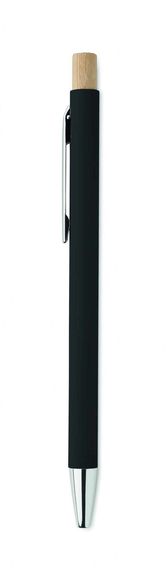 Шариковая ручка из переработанного алюминия с бамбуковой кнопкой. Серебристый наконечник и клип. Синие чернила.