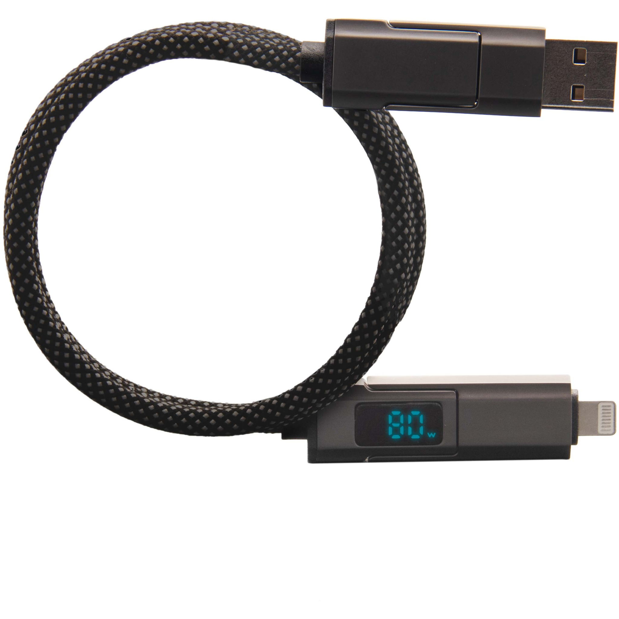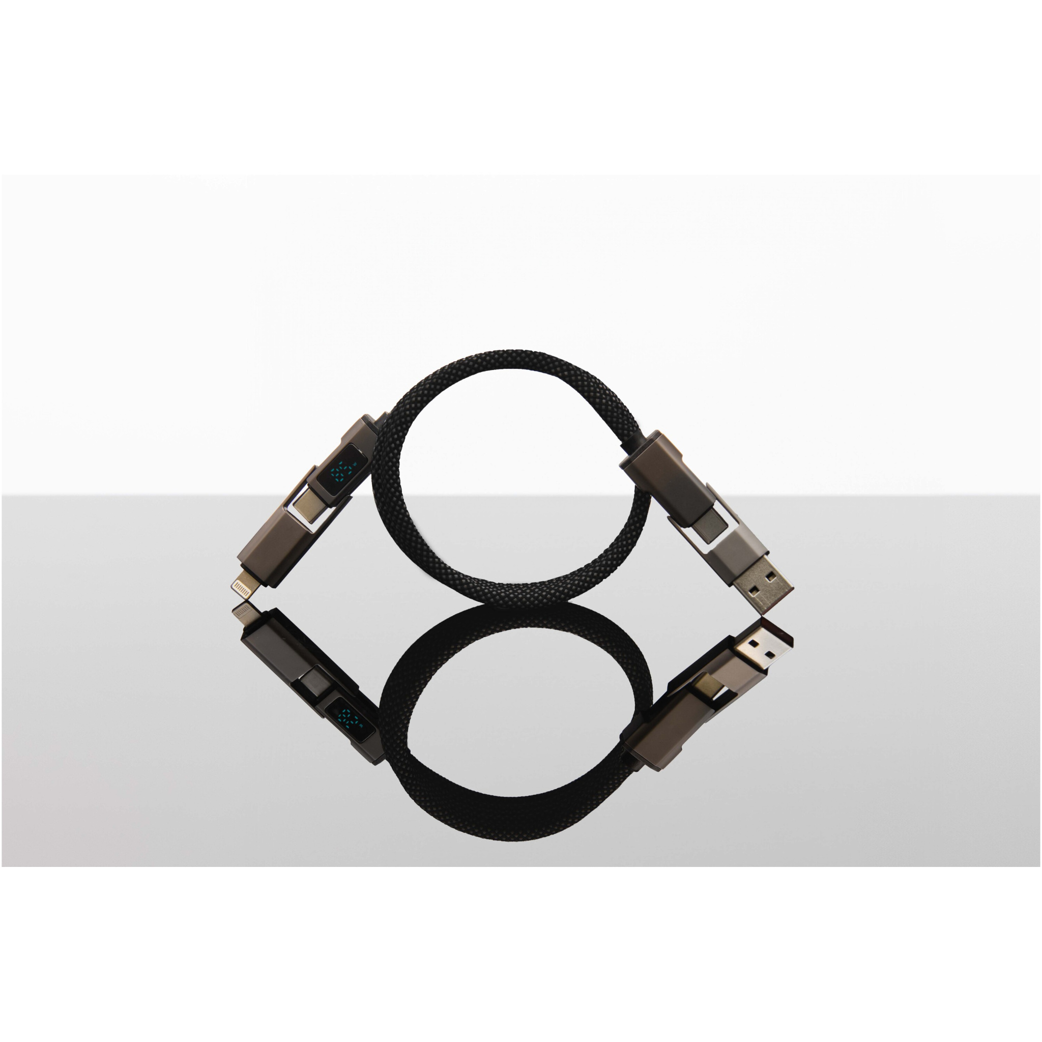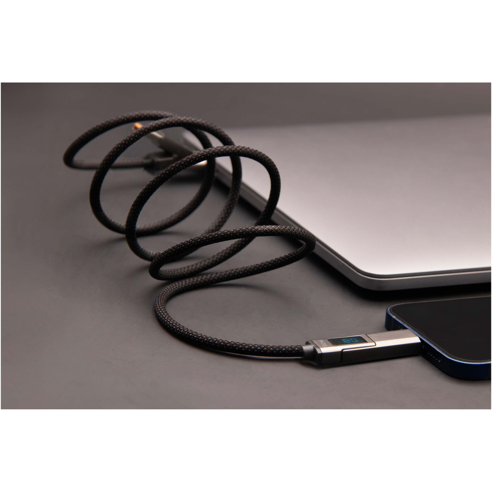 This ultra-fast 100W magnetic charging cable made from recycled nylon cords and zinc caps features a digital display for power delivery and is compatible with laptops, tablets, and smartphones. The cable supports USB-A and USB-C inputs and includes CarPlay functionality. Delivered in a recyclable TPU pouch. Cable length: 1.5 metres.