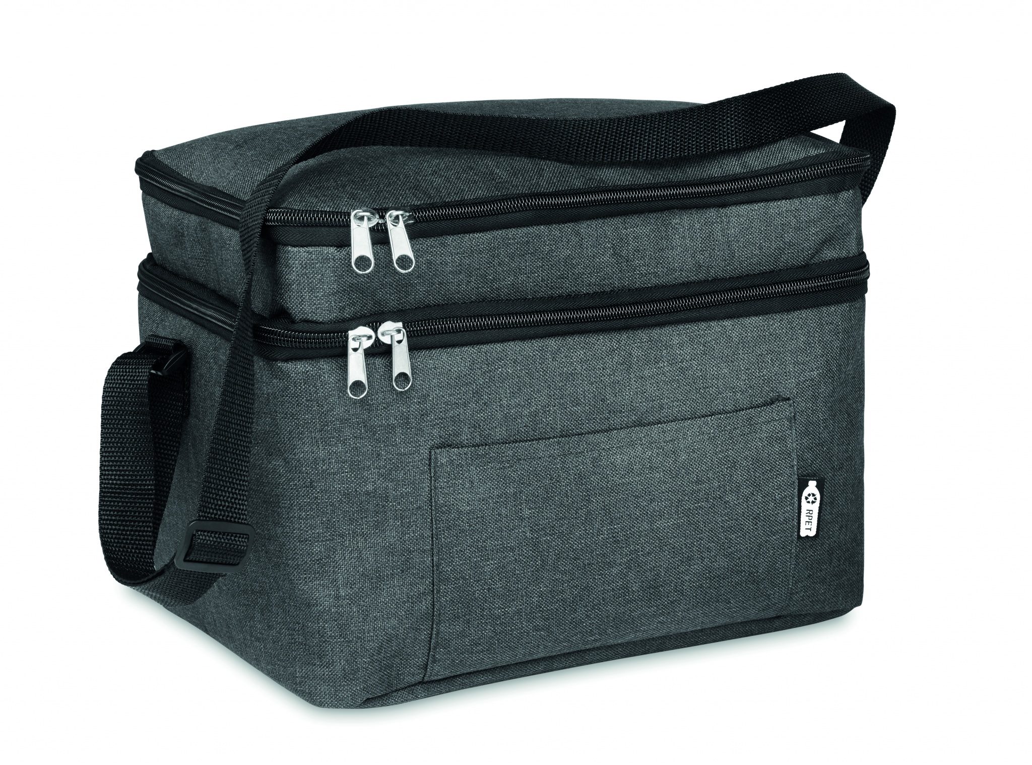 Двухцветная сумка холодильник из RPET 600D с 2 отделениями и подкладкой из PEVA. Регулируемый плечевой ремень и передний карман.