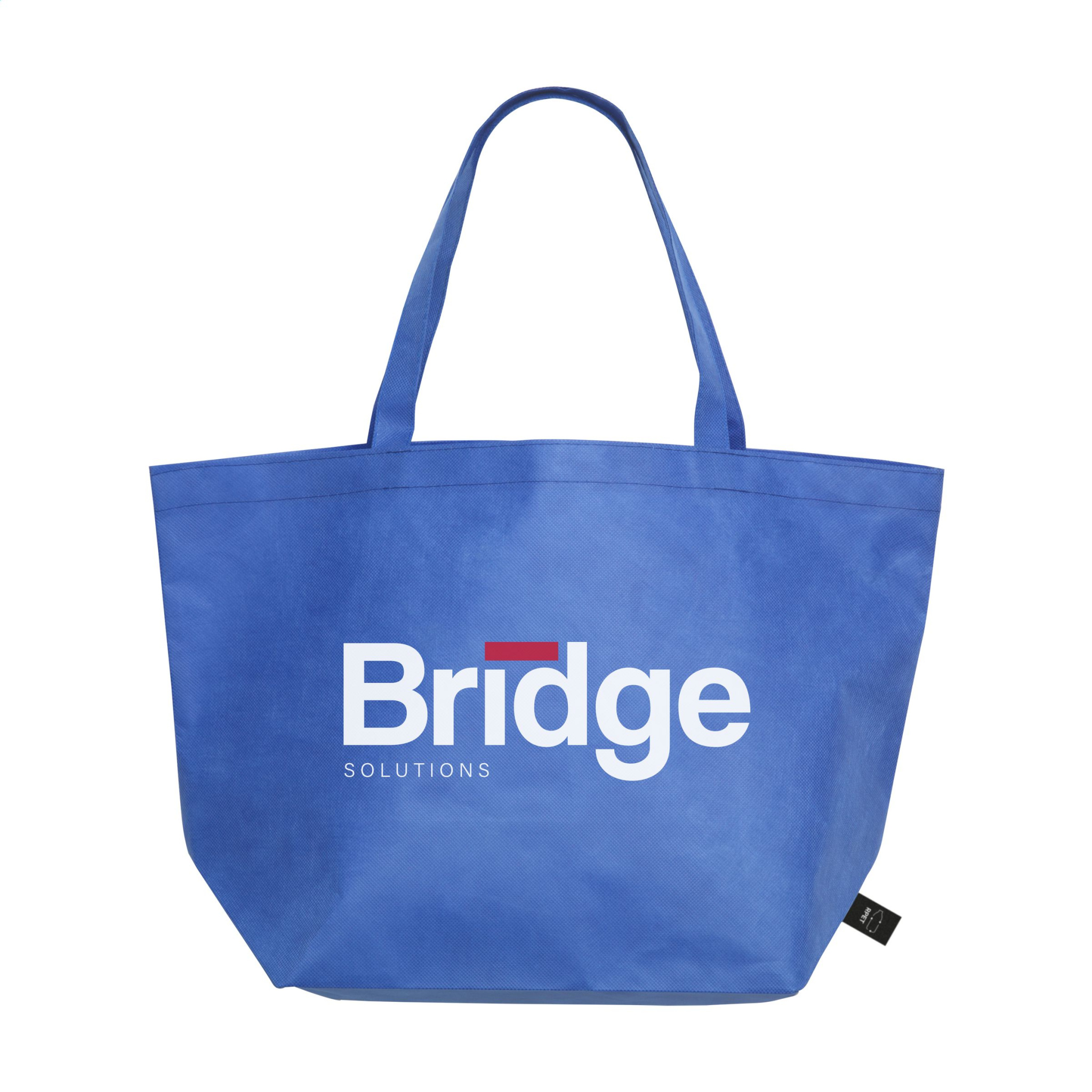 Большая сумка для покупок и пляжа из нетканого материала RPET (80 г/м²) из переработанных ПЭТ-бутылок. Широкая сумка, прочная и легкая, с длинными ручками. Вместимость около 25 литров.