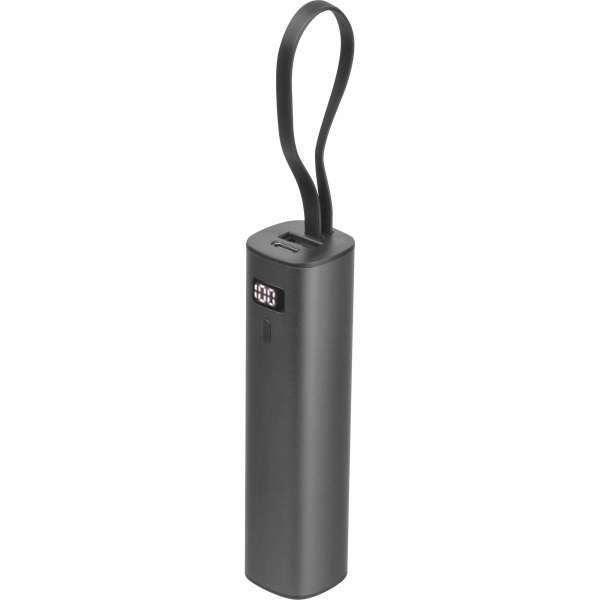 Внешний аккумулятор из алюминия с литий-ионным аккумулятором ёмкостью 5000 мА·ч, индикатором уровня заряда и встроенным кабелем USB-C для зарядки. В комплект входит кабель Type-A/Type-C длиной 30 см. Ваш логотип наносится под дисплеем с помощью лазерной гравировки.