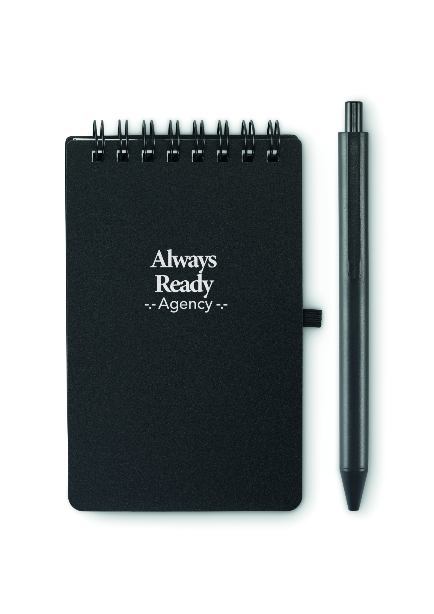 Water repellent notepad in PP cover with pen. Twin-wire. Mineral paper 120 gr/m², 50 sheets lined. Blue ink. Elastic closure strap and pen holder.