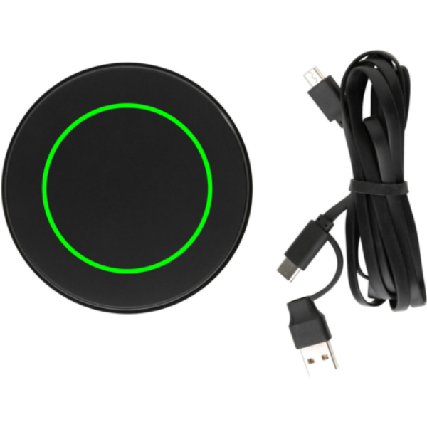 10W trådlös laddare med dubbelkontakt-kabel (USB A och USB C) där höljet är tillverkat av RCS certifierad återvunnen ABS och kabeln från återvunnen TPE. RCS (Recycled Claim Standard) är en standard för att verifiera återvunnet innehåll i en produkt genom hela leveranskedjan. RCS är den standard som används när en del av en produkt är tillverkad av återvunna material. Totalt återvunnet innehåll: 58% baserat på total produktvikt. Trådlös laddning är kompatibel med alla QI-aktiverade enheter som senaste generationen Android, iPhone 8 och upp. Input: 9V/1.5A. Trådlös output: 9V/1.1A 10W. Produkt och accessoarer är 100% PVC-fria. 150cm PVC-fri kabel i återvunnen TPE medföljer, kabeln erbjuder anslutning till både USB A och type C kontakter.