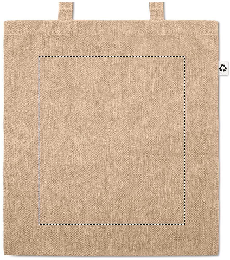 Tygkasse i tvåfärgad återvunnen bomull och återvunnen polyester med långa handtag (20%/80%). Ca 140gr/m². Den här artikeln kan krympa efter tryckning.