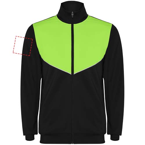 Träningsoverall i lätt och elastiskt tyg. Jacka med kontrasterande färg och sömnadskant på bröstet. Hög krage med kontrasterande sömmar. Centralt blixtlås fram. Sidofickor. 2 x 2 ribbade muddar och midja. Byxor med elastisk linning och dragsko. Kontrasterande sidostycke med sömnadskant. Dragkedja i fåll.
