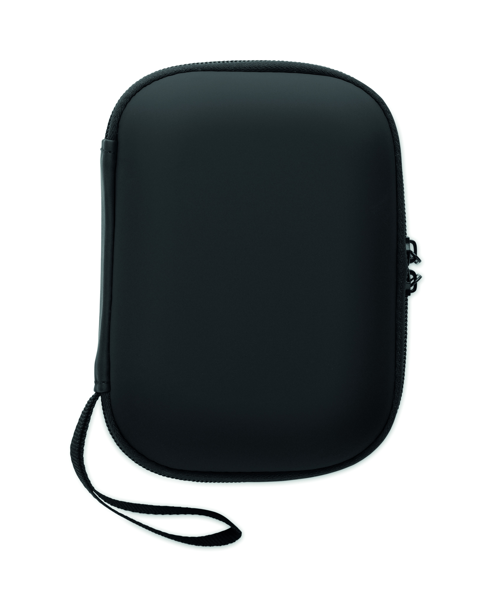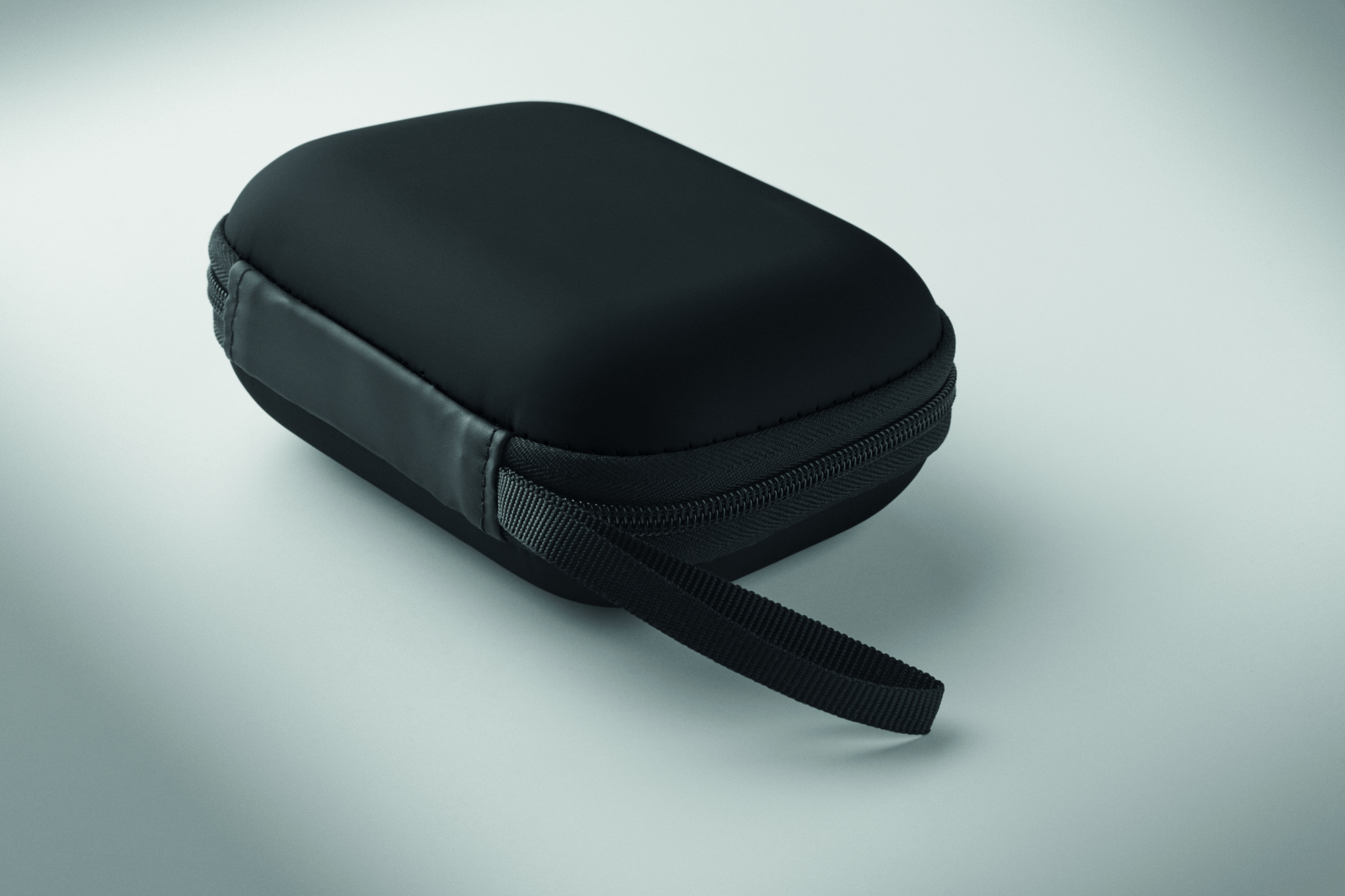 Första hjälpen-kit i hårt PU-fodral. Innehåller 2 handskar, 1 filt, 1 tejp, 2 bandage, 1 sax, 4 tops, 10 plåster och 6 rengöringsservetter. Ej tillgänglig för försäljning utanför EU.