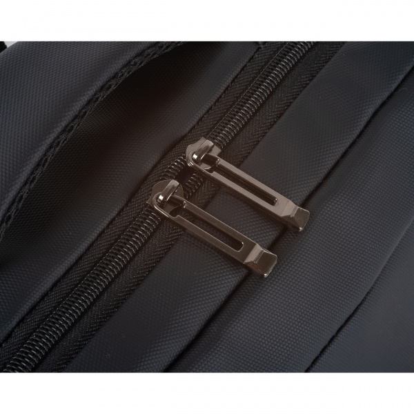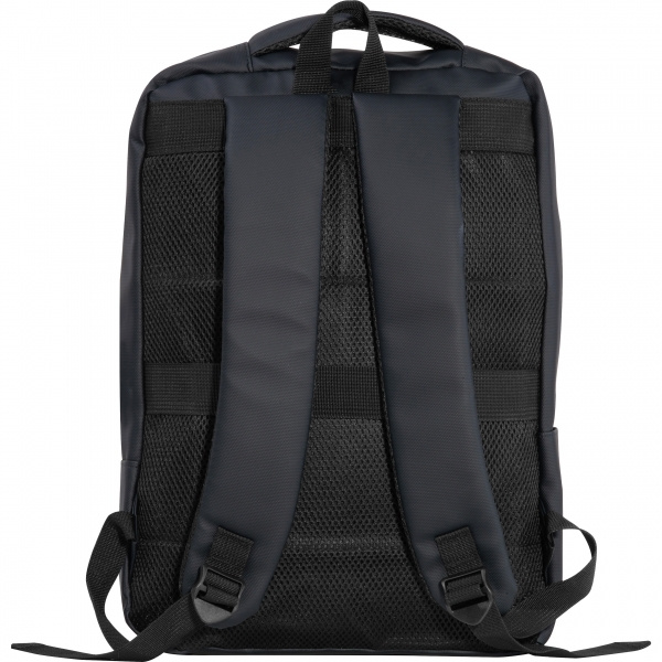 Laptopryggsäck tillverkad av PU för bärbara datorer på 15–16 tum. Den har två fack med dragkedja framtill, ett stort huvudfack med vaddering för den bärbara datorn, olika innerfickor, vadderade axelremmar, ett bärhandtag och en rem på baksidan för att fästa på en trolley. Din logotyp är applicerad på det främre facket.