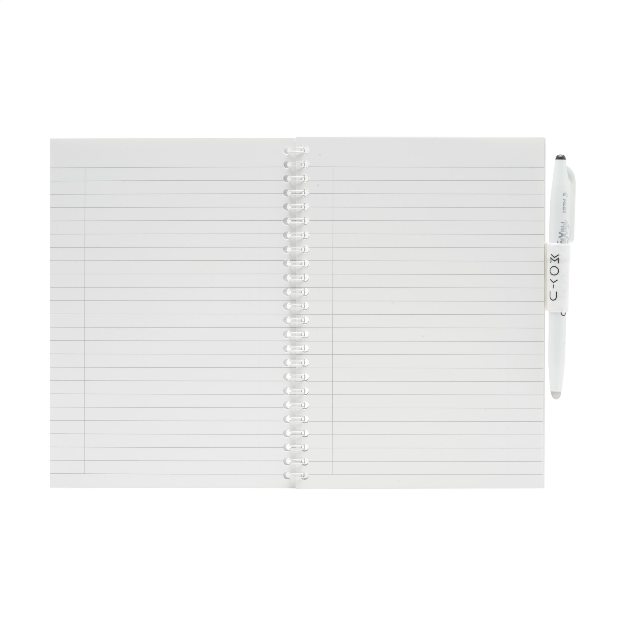 MOYU-märkt A5 raderbar anteckningsbok gjord av stenpapper. Med böjbart 400 gsm mjukt fodral. Den här anteckningsboken innehåller en penna och rengöringsduk. Varje sida av stenpapper är hållbart producerad, naturligt trädfri och 100 % återvinningsbar. Den här anteckningsboken, med en elastisk pennögla, är inbunden i ett kraftigt wire-o-band och har 18 sidors fodrat papper. Gör anteckningar med den medföljande, speciella MOYU-pennan. Denna penna innehåller det ursprungliga Frixion-bläcket. Detta speciella bläck torkar helt på stenpapper och är lätt att radera utan att lämna spår. Fukta den medföljande MOYU-duken lätt med lite vatten och radera bläcket. På så sätt förblir sidor tomma för nya idéer och att göra-listor. Du kan skriva på stenpapper 500 gånger i snitt. Den här anteckningsboken kommer att hålla dig i flera år. Stenpapper är tillverkat av 80 % kalksten och 20 % ren plast. Det är naturligt trädfritt, och inget vatten eller kemikalier krävs för att göra det. Produktionen av stenpapper är därför mer ekonomisk och producerar 67 % mindre CO2 än vid tillverkningen av massapapper. Dessutom kan stenpapper återvinnas i det oändliga, utan att behöva lägga till nya råvaror.