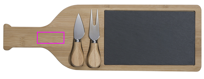 Ostbräda av bambu i form av en vinflaska med en griffel som kan sättas in, en ostkniv och en ostgaffel. Vi graverar din logotyp på skiffern.