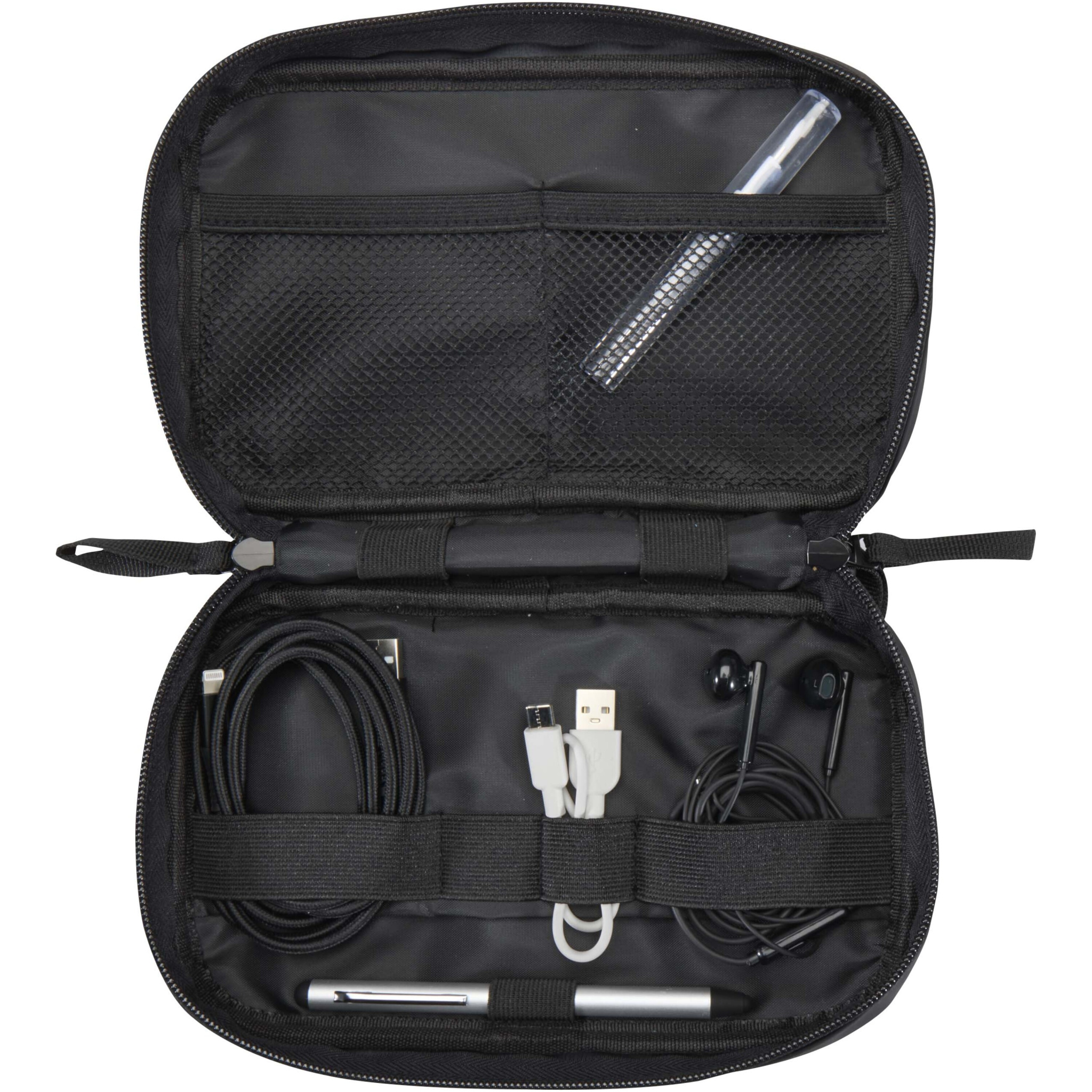 Denna teknikväska/tillbehörsväska är tillverkad av GRS-certifierat återvunnet PU-läder med ett matchande RPET-fodral och är utformad för resenärer, distansarbetare och teknikentusiaster. Den är kompakt och lätt att bära i en ryggsäck eller kabinväska och har ett huvudfack med dragkedja och praktiska organisationsfunktioner, inklusive en elastisk pennögla, två nätfickor för hörlurar och små tillbehör, en förstärkt avdelare och flera elastiska öglor för att säkert hålla kablar, USB-enheter och laddare. På utsidan finns en framficka med kardborreknäppning för snabb åtkomst samt ett handtag med band för bekvämlighet. Den är försedd med en vattenavvisande beläggning och håller dina viktigaste saker skyddade var du än går. Volymkapacitet: 1 liter.