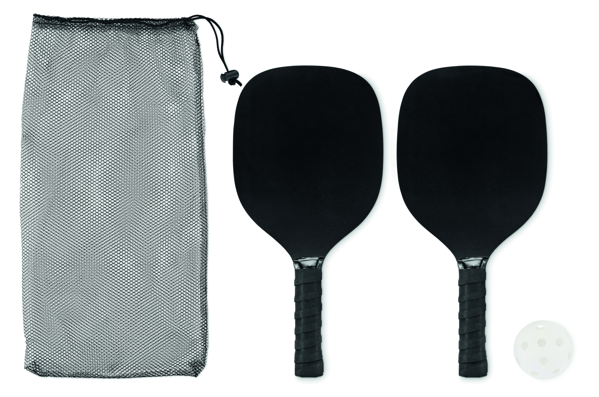 Pickleball-paddel set med 2 träracketar och 1 boll i RPET nätfodral med dragsko.