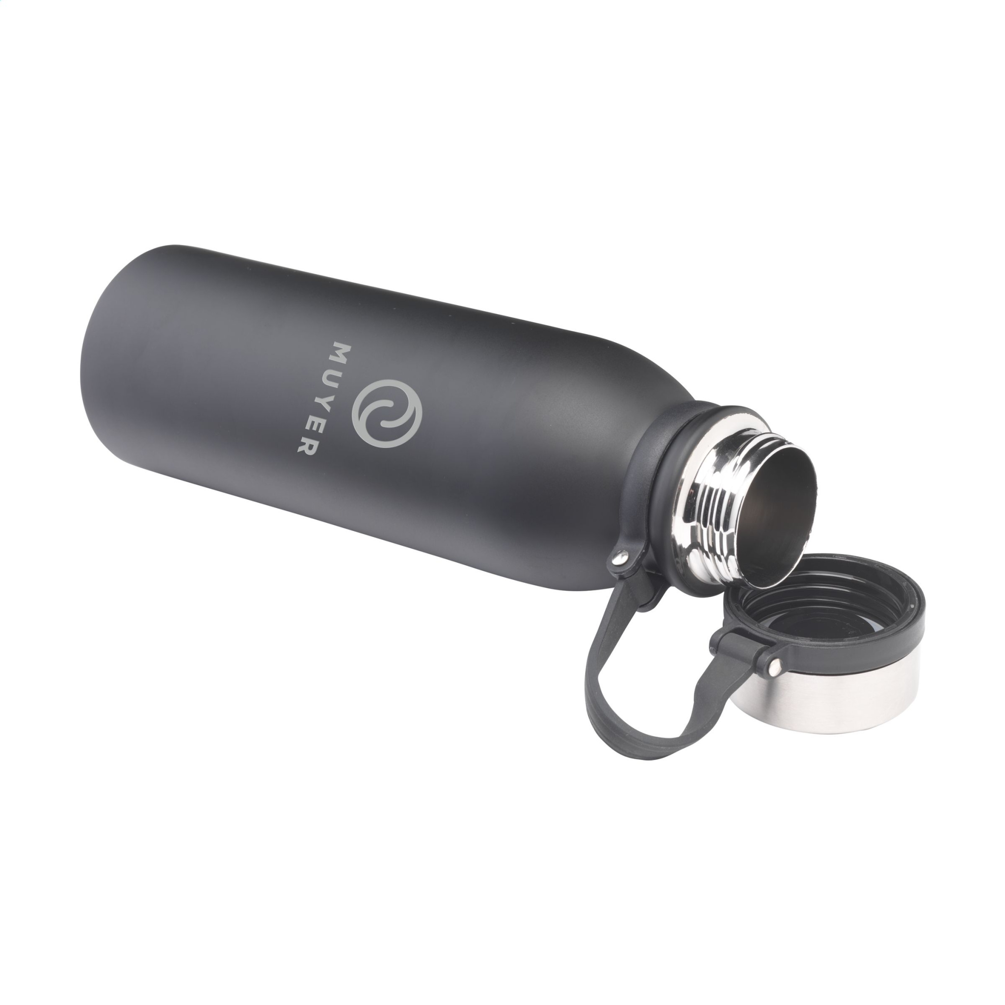 Dubbelväggig, vakuumisolerad, läcksäker vattenflaska/termoflaska i rostfritt stål. Skruvlocket fästs på en vridbar silikonbärrem och sitter kvar när flaskan är öppen, så att du alltid har en hand fri. Lämplig för att hålla temperaturen på kalla eller varma drycker. Kapacitet 600 ml. Varje föremål är individuellt förpackad.